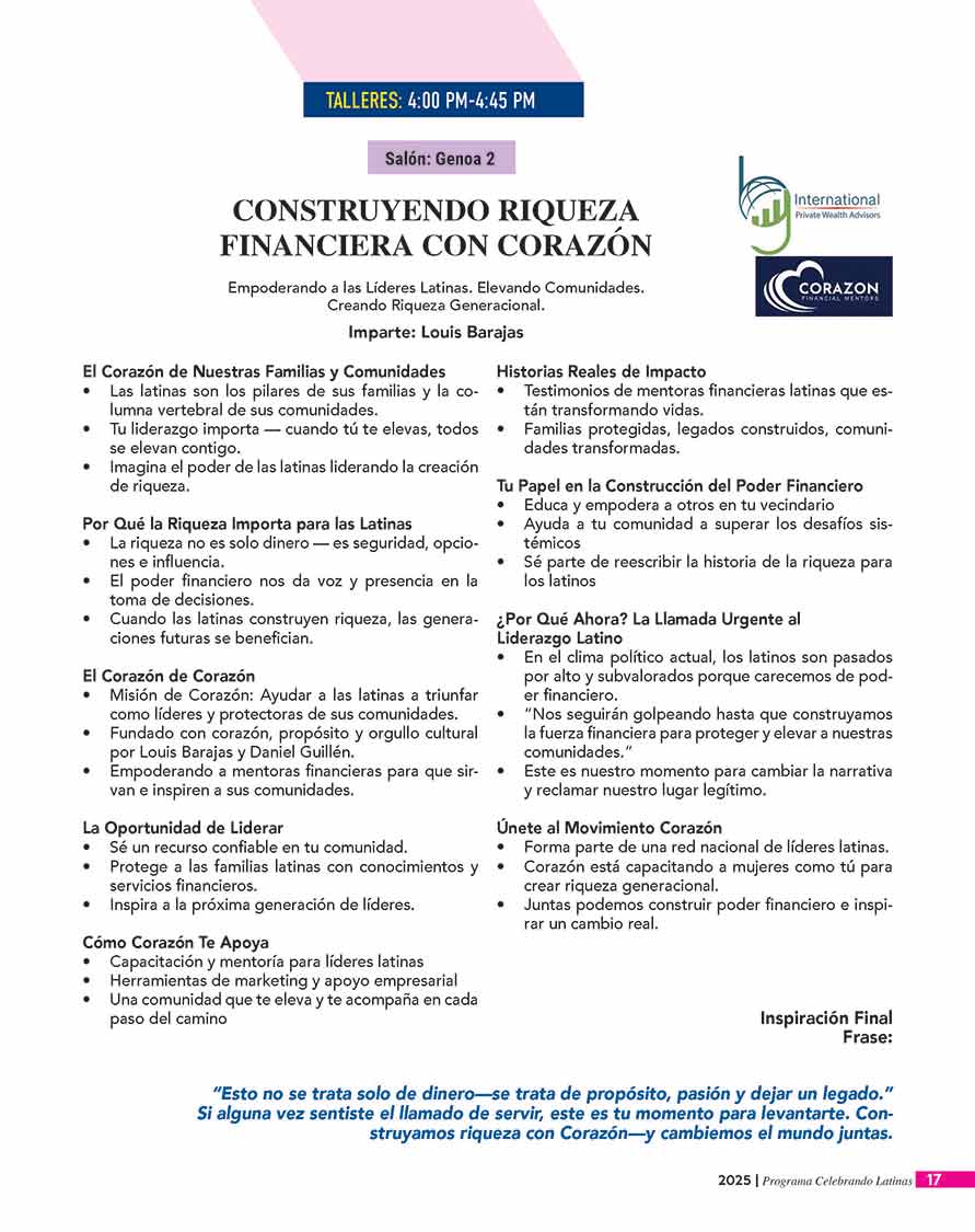 Parte fundamental del evento Celebrando Latinas son sus talleres que históricamente han empoderado a miles de mujeres de nuestra comunidad. Para cada edición de Celebrando Latinas el periódico El Latino se preocupa por ofrecer un programa diverso sobre los temas que más afectan la vida diaria de las latinas como finanzas, salud, belleza, negocios y superación personal.